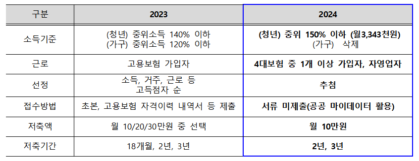 - 기존 기준중위소득 140% 이하에서 150% 이하로 상향 조정되어 월 소득 3,343천 원 이하의 청년들이 신청할 수 있습니다.