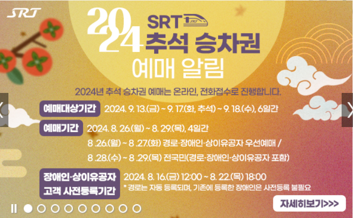 2024년 추석 SRT 승차권 예매는 9월 13일(금)부터 9월 18일(수)까지 6일간