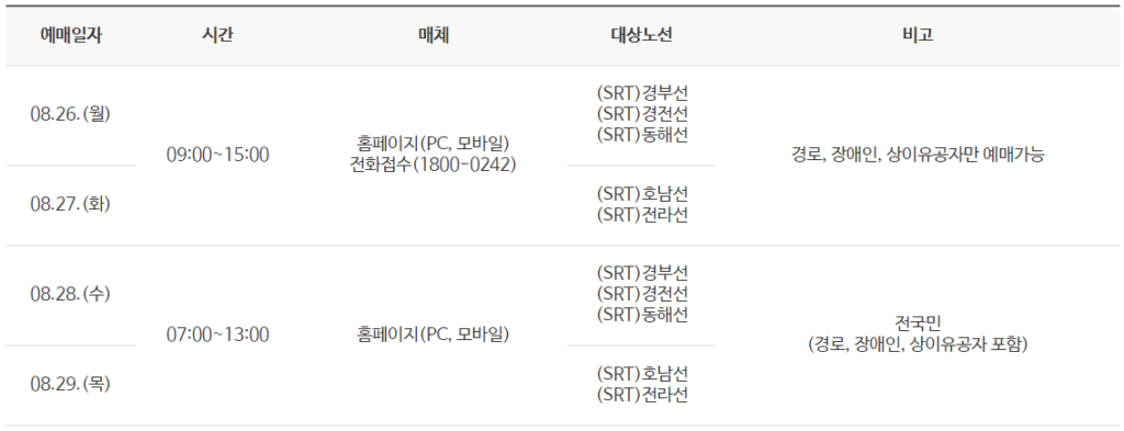 일반 국민 대상 예매는 8월 28일(수)과 29일(목) 진행됩니다. 명절 예매는 경쟁이 치열하니, 꼭 예매 시작 시간 전에 미리 준비해주세요!