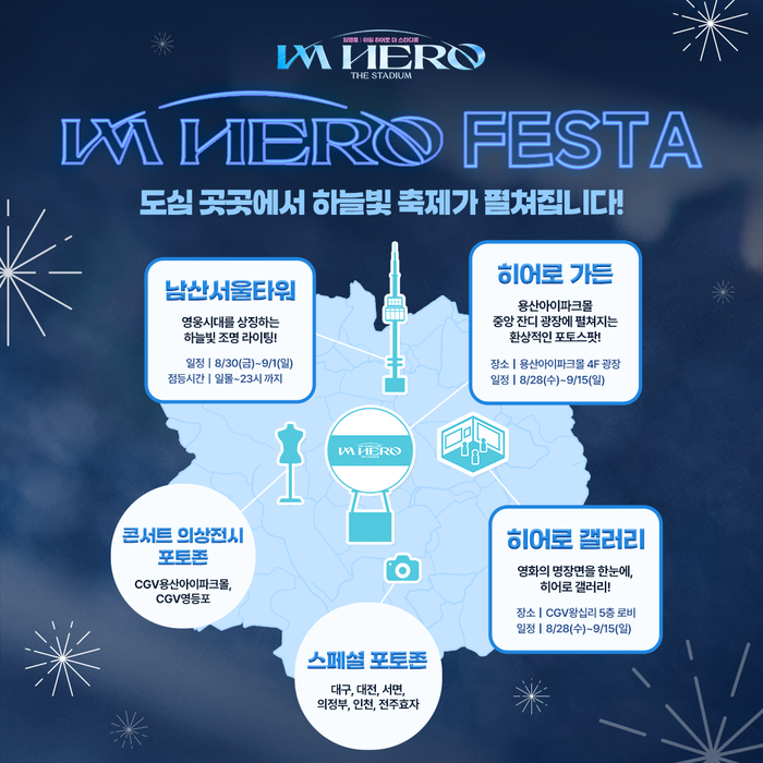 - 남산서울타워 하늘빛 조명 라이팅: 8월 30일부터 9월 1일까지 임영웅의 팬컬러인 하늘빛 조명이 도심을 물들입니다.